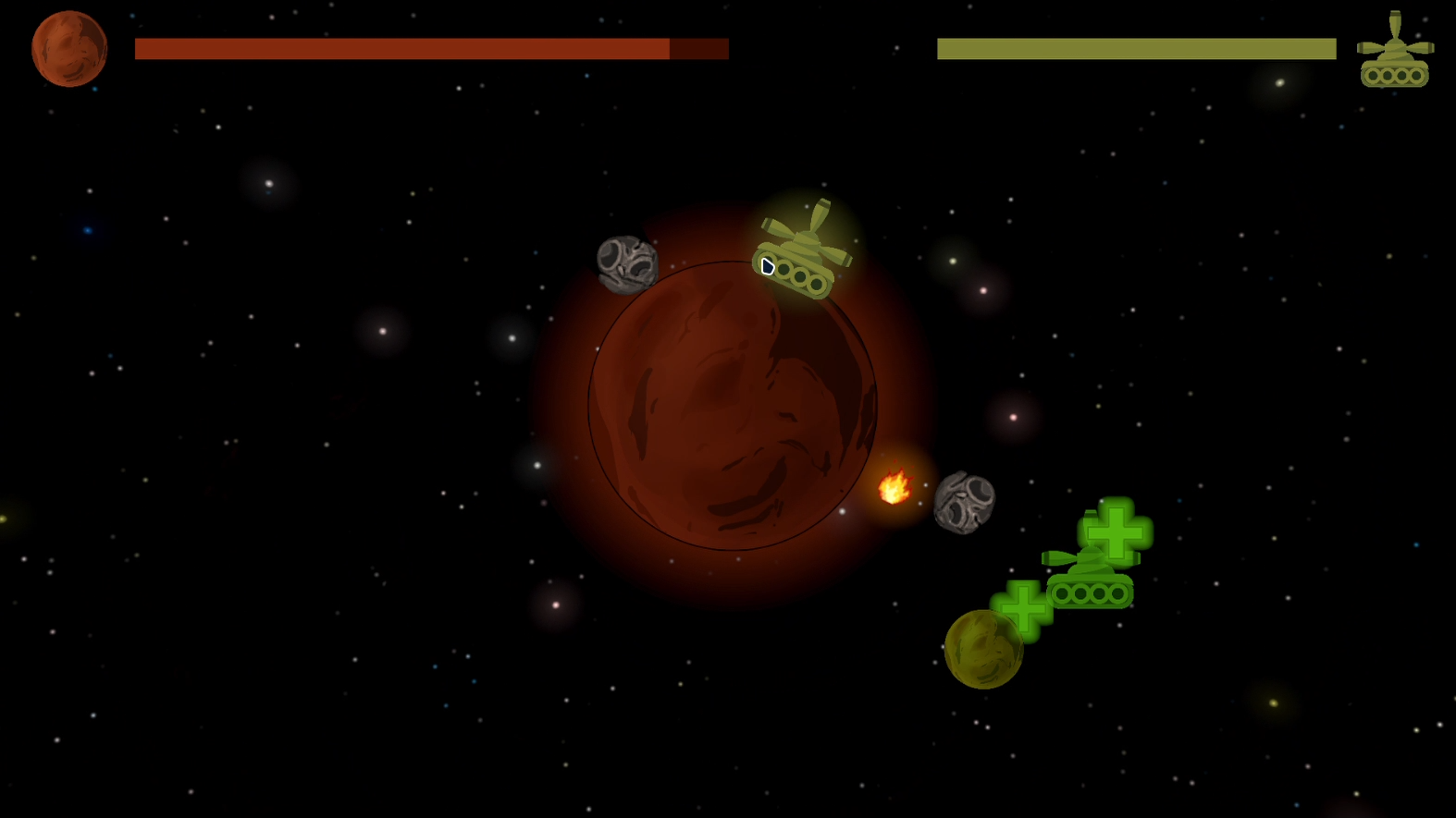 - The left and right projectiles rotate around the planet until it's hit by an asteroid or a pickup, or the tank itself.